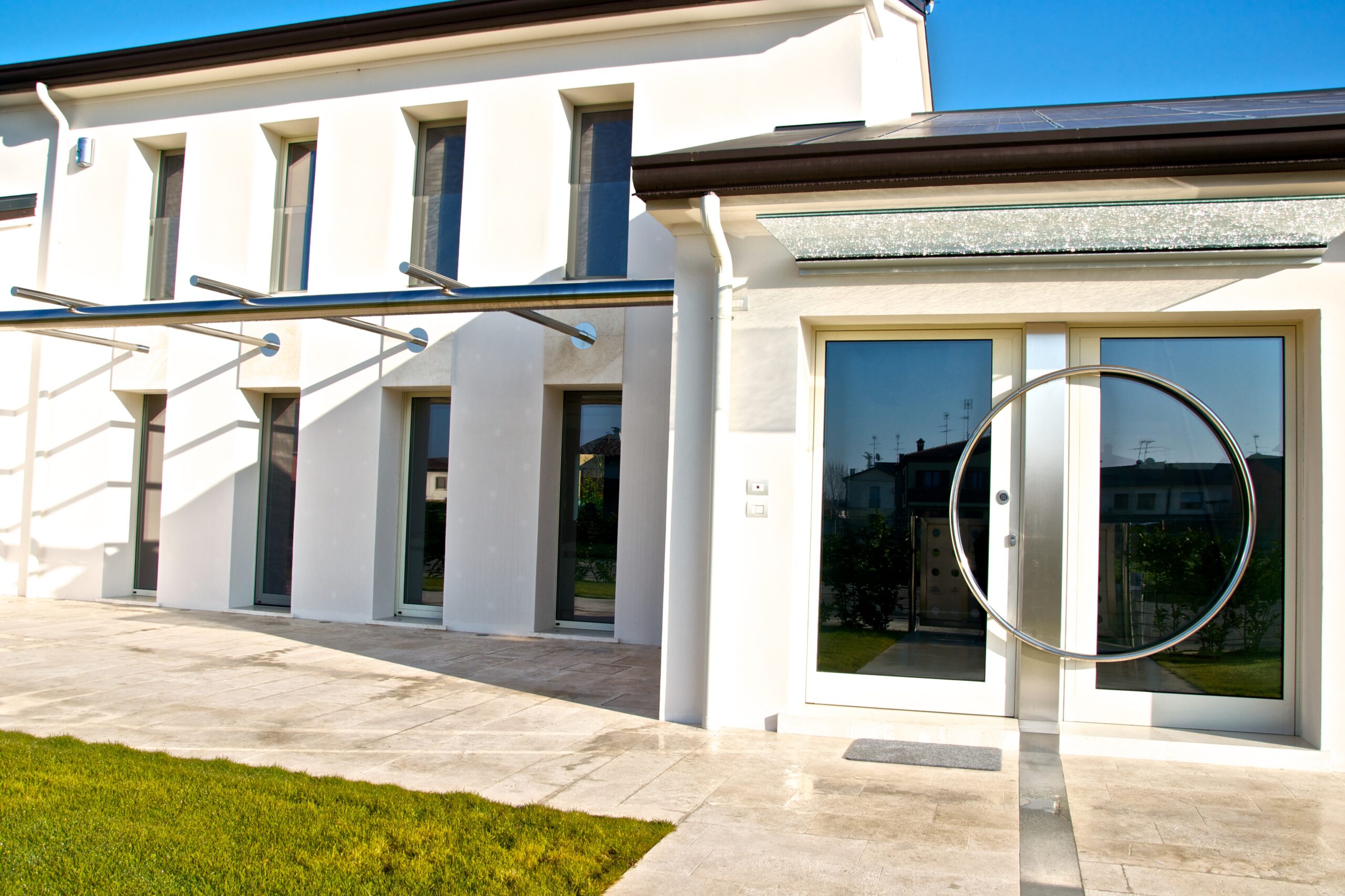 Uno stile moderno ma allo stesso tempo caldo e accogliente, per questa villa privata nel trevigiano. L’edificio è caratterizzato da un imprinting architettonico immediatamente riconoscibile, ben espresso dall’imponente portale d’ingresso con serratura elettronica dotata di tastiera esterna.
